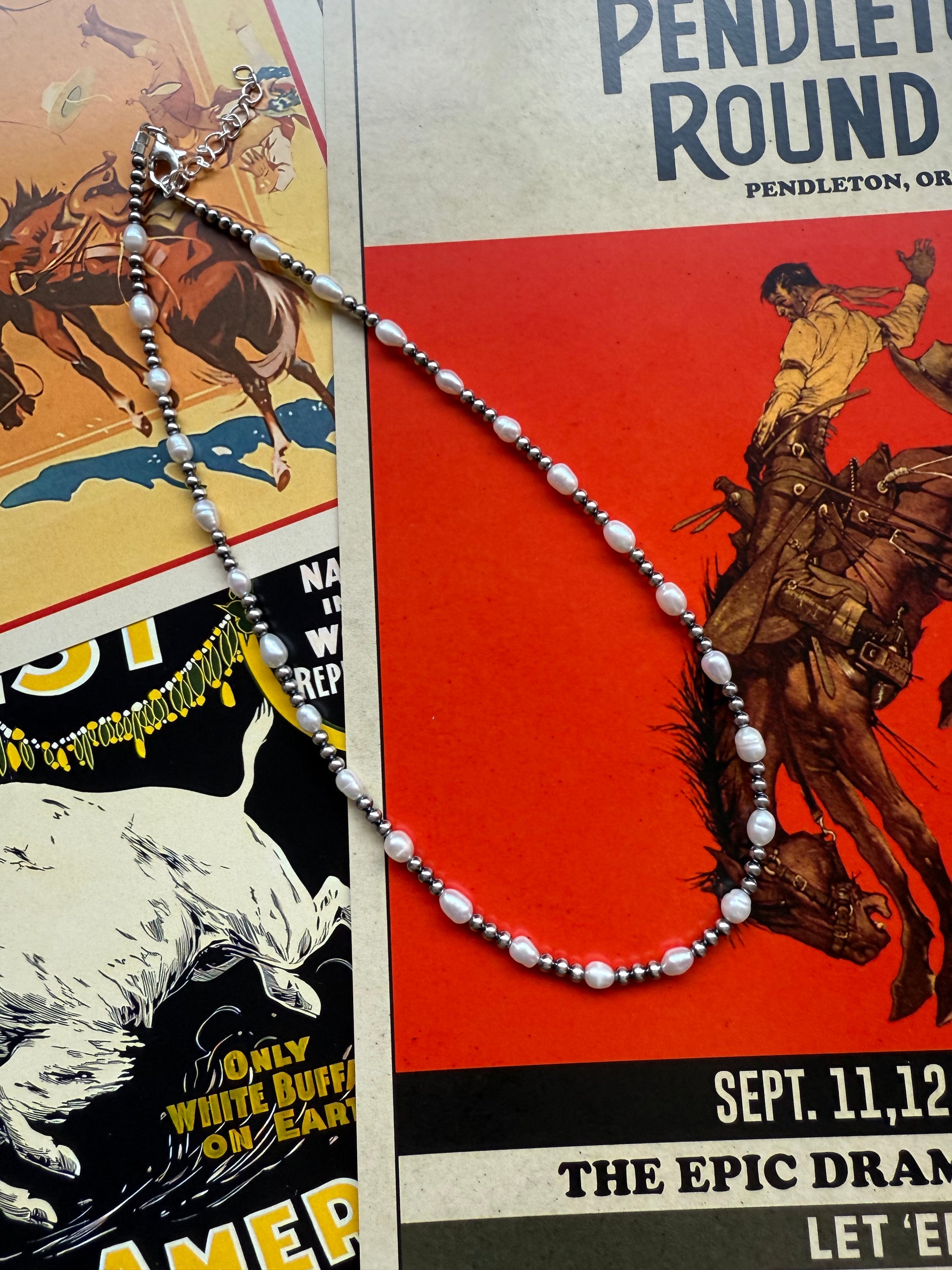 A refined take on a classic pearl necklace, featuring elongated freshwater pearl beads paired with sterling silver machine-made pearls for contrast and texture. The mix of organic pearl shapes and polished silver gives this piece an elevated, wearable look that layers beautifully or stands on its own.